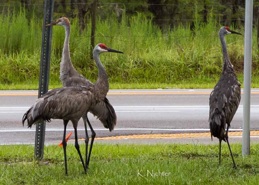 We went to Brooker Creek Preserve this past week, early in the morning as it rained off and on during the night and the forecast predicted more rain. As we pulled in we saw this Sandhill Crane family so Karl stopped far enough away for me to take a few shots without disturbing them too much. “Junior” is as tall as his parents, but doesn’t have all the coloring yet.