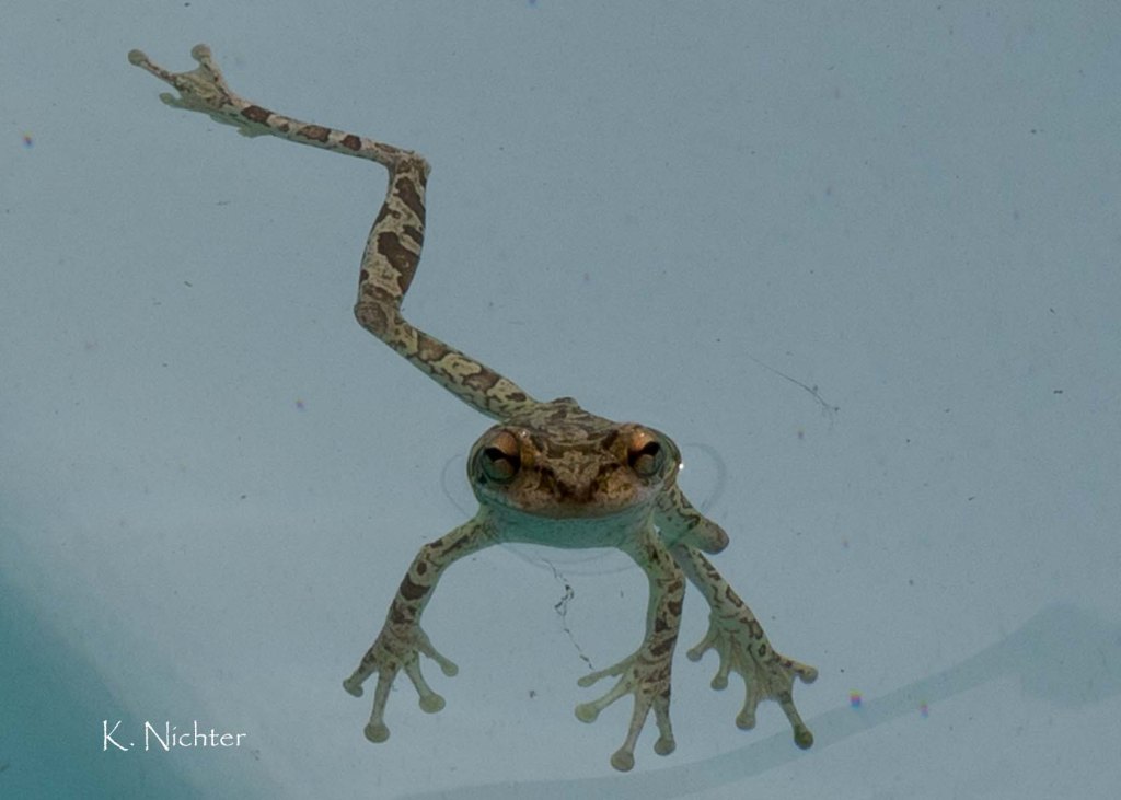 We discovered that wildlife still flourished there, though a few individuals became temporarily displaced during the work. This frog, who we believe is a Southern Leopard Frog, managed to get into the pool area for a swim. We netted him out, and put him near the fence where he hopped toward the creek.