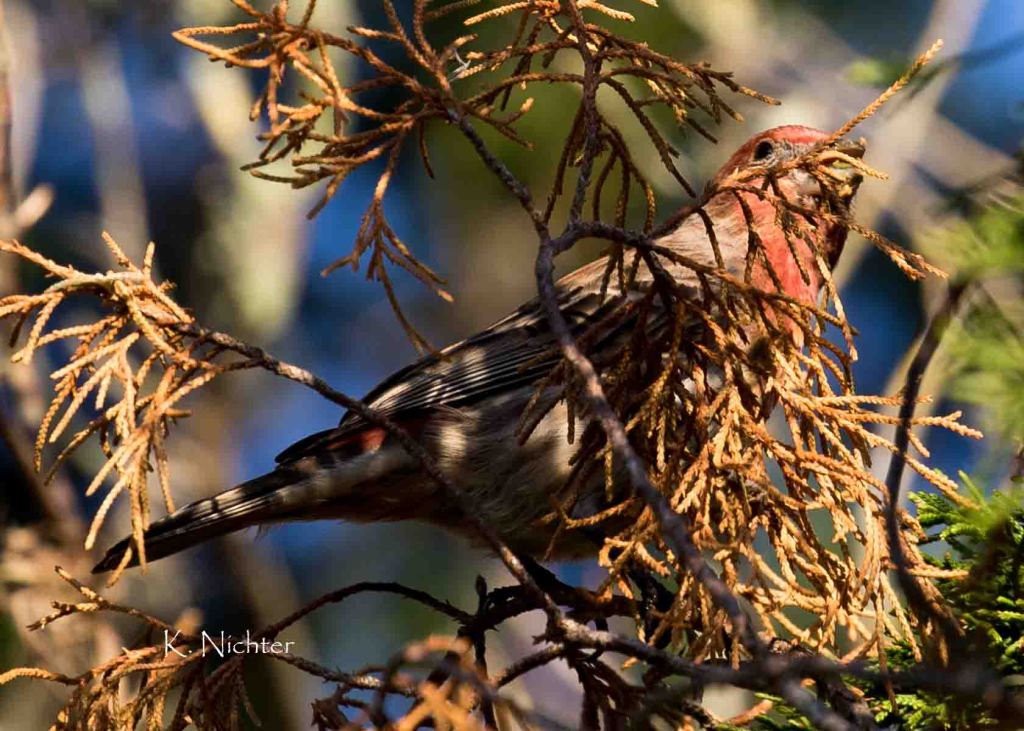While photographing birds on a recent hike, I noticed a flash of red. I put my zoom on the bird, not sure if I had time to get my binoculars out. I watched and two birds flew around the trees, one stopping long enough to peer in my direction.