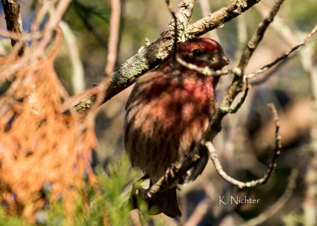 I checked further, and found that birders had already recorded seeing two house finch at this park just two months ago. Several commenters believe that they are extending their range. While this is not a new bird to me, it is a new one to my list of those seen locally. As you can see from the two photographs, they were not exactly eager to make getting a photograph of them easy.
