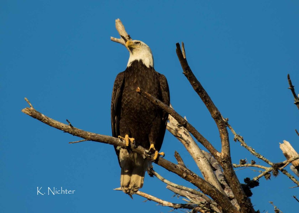 We walked the trails we knew, pointing out to each other the changes. Birds sang, chirped, and flew everywhere. An eagle zoomed overhead, being chased by an osprey. The eagle perhaps ventured too close to a nest. Two fellow hikers near us watched the chase and asked about the birds. Karl explained what they were, and what was likely happening. We told them we have watched eagles chase osprey that just caught fish and harass them attempting to get the osprey to drop the fish.