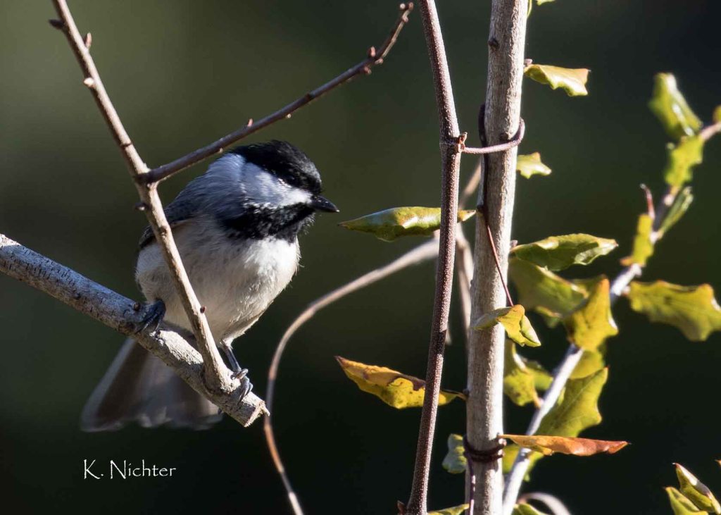 We walked into one section full of small, fast darting birds mostly hiding in the foliage. Most flew too fast across the trails from one tree to another, so we walked slowly stopping frequently to watch the activity. This Carolina chickadee finally landed in view so we could see it.