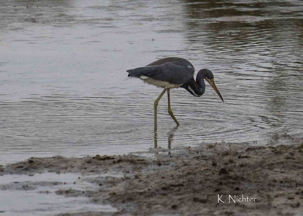 The fog, gray overcast sky, and diffused light with no sign of sun made the entire scene monochromatic. The only points of color came from the white on the Tri-color heron and the crown and head of the Yellow-crowned Night heron. An osprey circled overhead, and then we heard the familiar cry of the Sandhill cranes. I tried to get a shot as they went over, and came out with an acceptable one. My tracking skills with the lens need improvement.