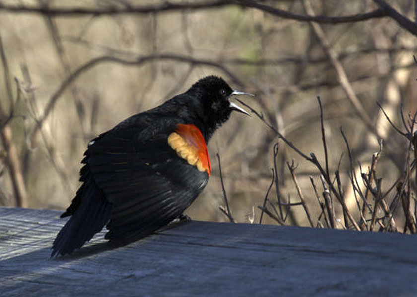 Some were clearly territorial squabbles. The Red-winged blackbirds, wings very bright in the sun, flew around each other, landing and chasing on this rail. As I watched, this male fluffed his feathers and expanded his chest, and let out his assertive call. The other males stopped bothering him, I guess he made his point.