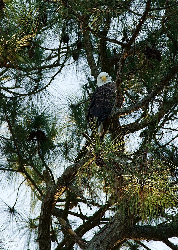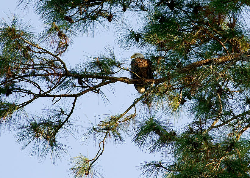The light hitting his feathers was interesting, lighting up the two white feathers on the chest and the white of the tail. He remained unperturbed with the two photographers taking his photograph and watching him through binoculars. Karl continued to “work the scene” as we are always taught in photography courses, while I admired a Tri-colored heron walking by on the beach, also not too concerned about us. When we compared photographs, Karl definitely had the best one of the traditional pose in the tree, and captured one of the eagle looking down at us.