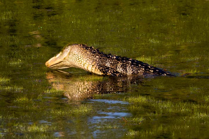 The first two mornings the resident alligator remained out of sight. On the third morning it swam slowly, then arched up several times, plunging its head into the water, and moving about. Each time it returned to its slow swim, no sign of a breakfast catch in its jaws.