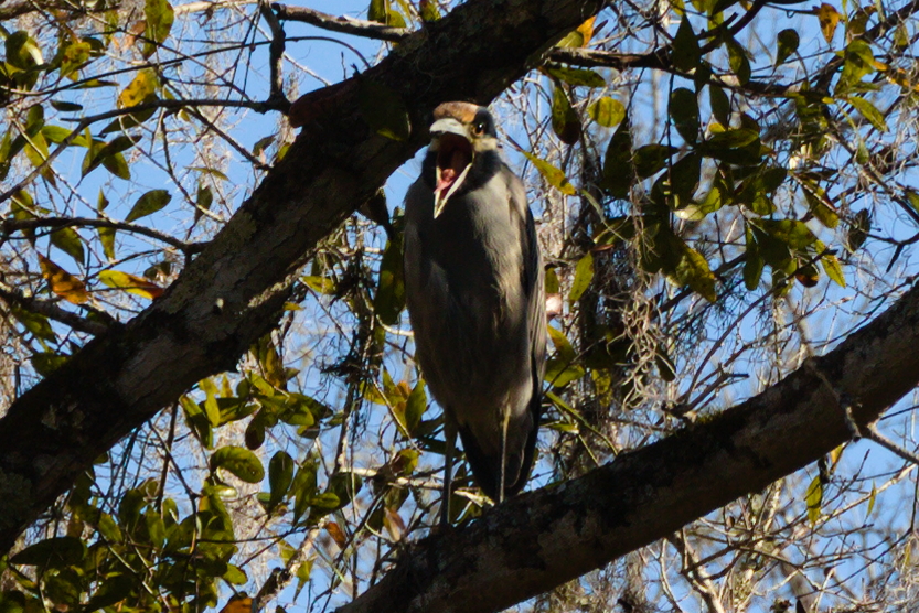 We stood on the bridge near the parking lot that leads to the trails, observing this juvenile Black-crowned night heron. It stood so still as to be barely visible, still very brown though starting to get the black adult color. It occasionally moved its head very slightly, until suddenly the beak opened and it gave out a big yawn. Wait a minute, do birds yawn? I checked, and yes apparently birds do yawn, and for a similar reason as humans and other animals, to expel carbon dioxide and take in additional air. I read several reasons for this, but suspect as we had been observing this bird for some time that the period of inactivity triggered a need for more air in the lungs.