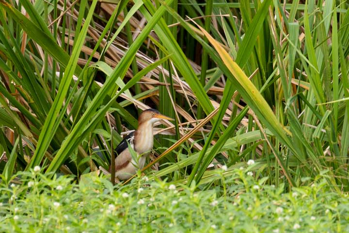 We watched the adult Least Bittern fly in directly to the clump, hidden from view. She made her way through to a section, fed a chick and immediately flew away. As we walked along the boardwalk she flew past us and landed further on searching for more food. She kept well hidden, but I did get one photo.