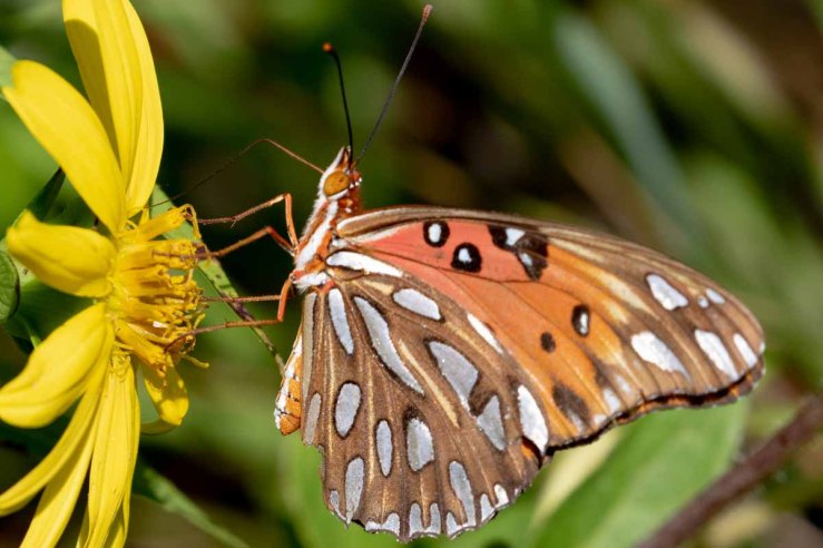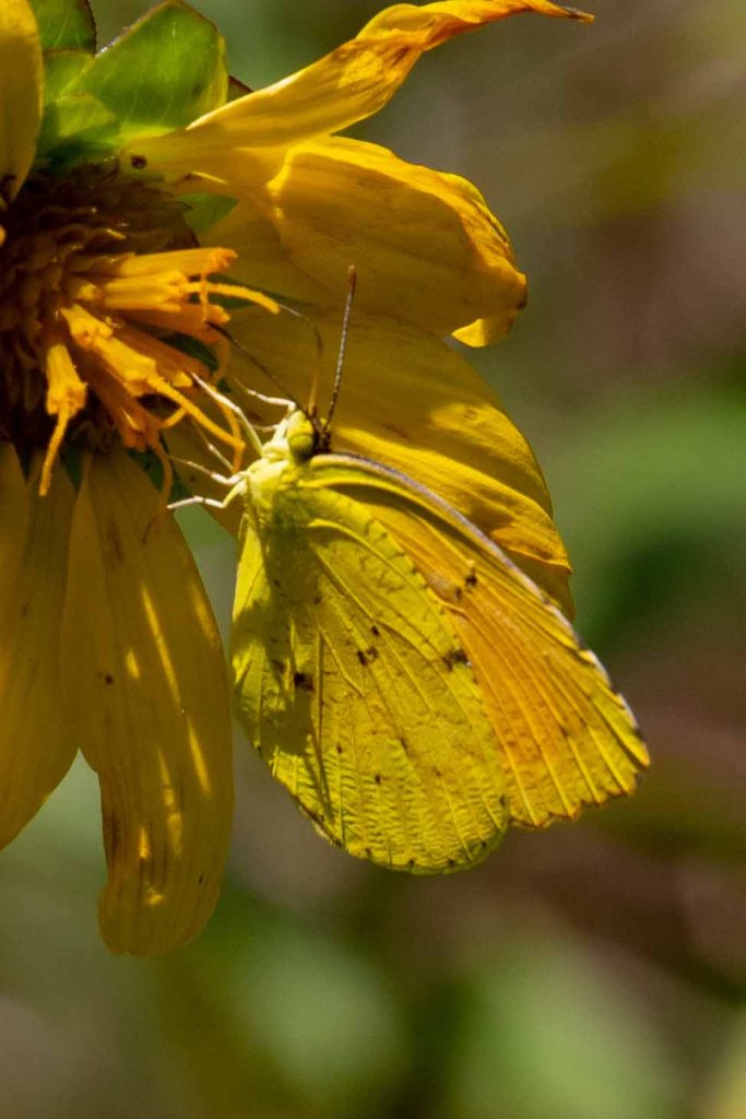 Early that morning the garden volunteers worked to clear and maintain the garden. As I watched butterflies took advantage of the flowers and their work. I noticed a new butterfly with a bit of light orange flying around, and went outside to see. At that point three butterflies worked the flowers, a Gulf Fritillary, a Sooty Wing, and the one I spotted, an Orange-barred Sulpher. The Sooty Wing flew quickly about landing and taking off, and often landing where one of the others already sat, seeming to bounce off them as they also took off. The activity continued for several minutes, then calmed down, the ONLY activity we saw on this very hot afternoon.