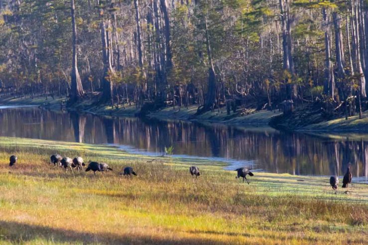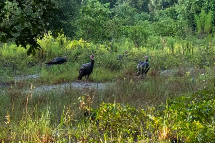 Our first visit was to the Savannah Sill, always a favorite and surprisingly empty. As we approached, we saw a flock of turkeys on along the water. As we slowly approached, they noticed the car and began to march slowly, mostly in single file, up the slope and across the road. We stopped the car to watch, then slowly drove by as the last one entered the woods. The area has experienced a drought, and it shows along the banks of the sill.