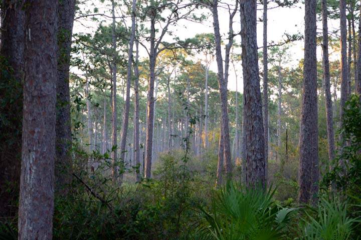 View from the RV window, sunrise on the pine flatwoods just hitting the trees