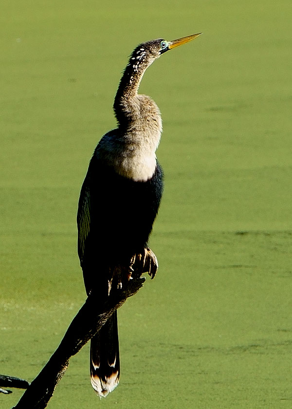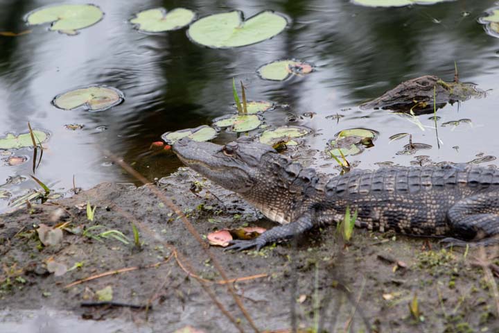 The first two mornings the resident alligator remained out of sight. On the third morning it swam slowly, then arched up several times, plunging its head into the water, and moving about. Each time it returned to its slow swim, no sign of a breakfast catch in its jaws.