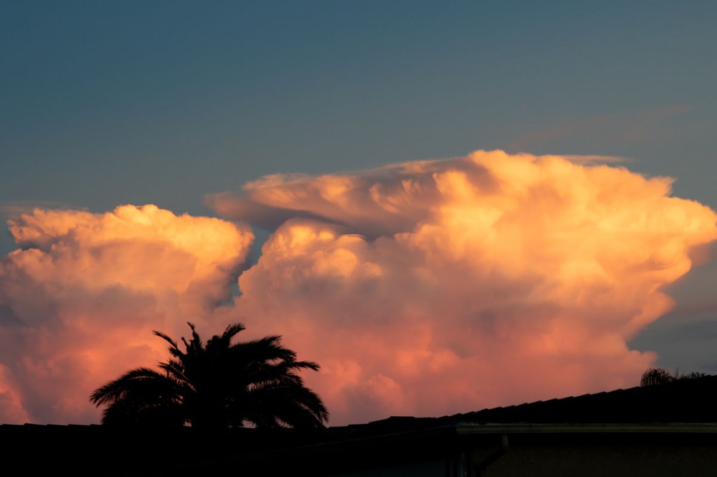 We walked out to see the morning sun lighting up this large anvil shaped cloud in the sky, offshore in the Gulf. I took two photos, then just watched it for a bit. This scene lasted a few minutes, then the color faded and the shape began to dissipate.